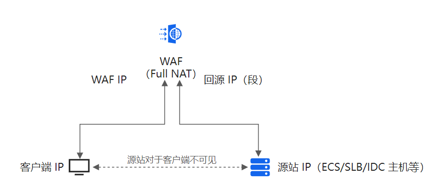 日常访问网站域名时,域名映射到阿里云waf防火墙地址,由waf过滤请求后再访问源站,源站不直接暴露到互联网公网。