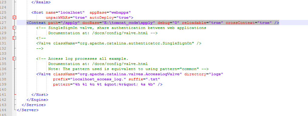 <Context path="/apply" docBase="E:\tomcat_code\apply" debug="0" reloadable="true" crossContext="true" />